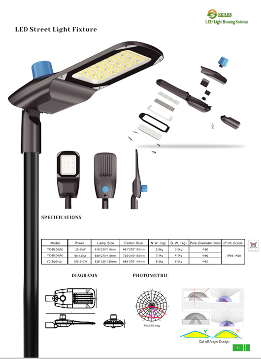 | EK-BL04(S) | 618*230*116 | 20-80 Вт (ліхтарний стовп 60 мм) | Алюмінієвий корпус, загартоване скло, гумове кільце, гвинти |